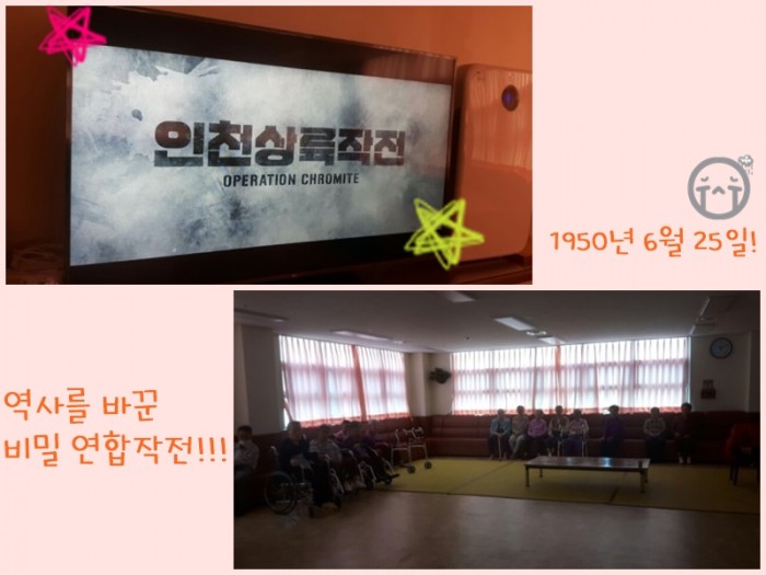 오늘 생활체육 프로그램 휴강으로 어르신들께서 <인천상륙작전> 영화를 시청하셨습니다. 1950년 6월 25일 북한의 기습 남침으로 불과 사흘 만에 서울 함락,
