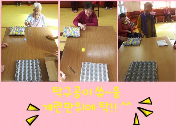 어르신들과 함께 계란판에 탁구공 넣기 게임을 했어요^^