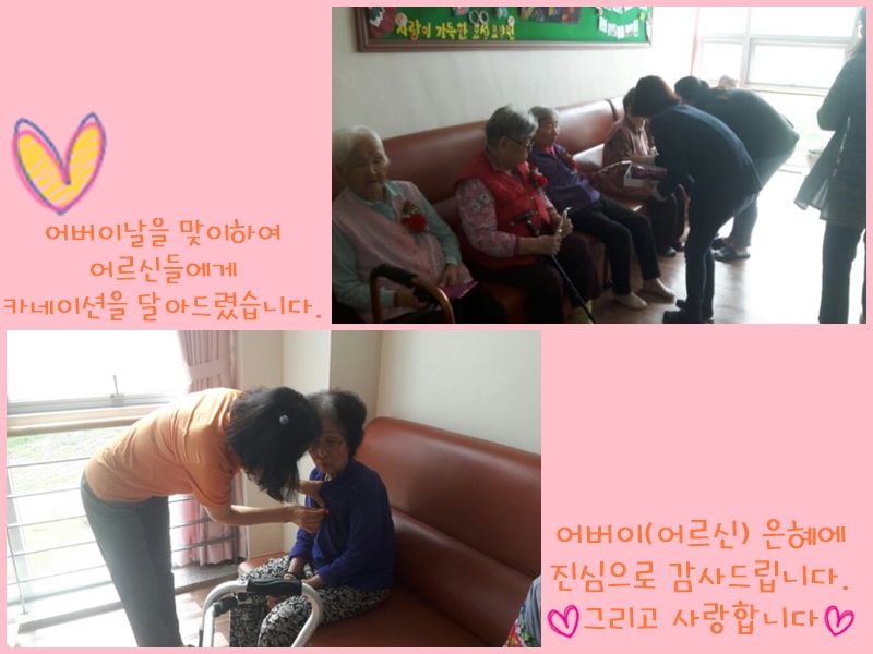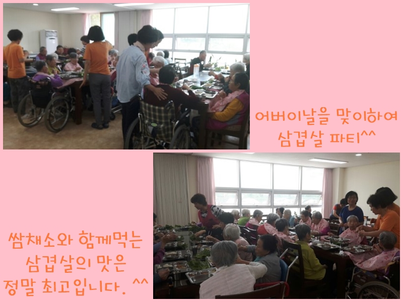 2017년 5월 8일!!! 어버이의 은혜에 감사하고, 어른과 노인을 공경하는 경로효친의 전통적 미덕을 기리는 날. 어버이날입니다. 어버이날을 맞이하여 어르신들에게 카네이션을 달아드렸습니다. 곱고 고운 카네이션을 달아드리니, 너무나도 기쁘다며 눈물을 보이시기도 하고, 고맙다는 말을 아끼지 않으셨습니다. 어버이(어르신) 은혜에 다시 한번 깊은 감사 드리며, 사랑합니다. ^^ 그리고 점심시간에는 어르신들에게 삼겹실을 구워드렸어요. 식당 및 각 층에서 삼겹살을 드시며 맛있다고 행복하다고 하시는 어르신들의 모습을 보니, 앞으로도 삼겹살 파티를 자주 해 드려야 할 것 같습니다. ^^ |