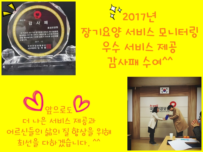 2017년 장기요양 서비스 모니터링에 참여하여 우수한 서비스 제공으로 노인장기요양보험 제도발전에 기여한 공로가 인정되어