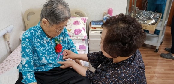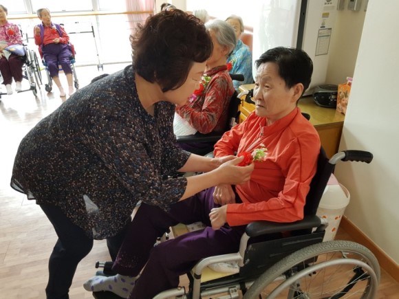 어르신들 한분한분에게 사랑의 카네이션을 달아드리고, 어머님 은혜를 부르며
