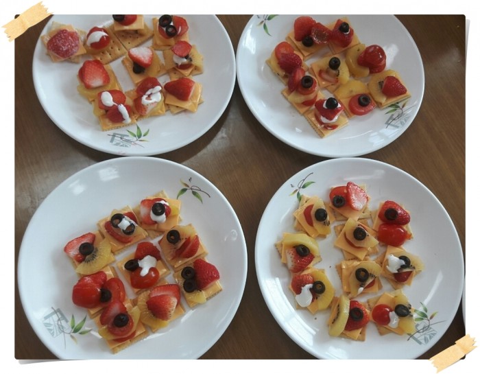 바삭한 크래커에 상큼한 키위, 딸기, 방울토마토, 올리브, 그리고 치즈,까망베르치즈를 올려