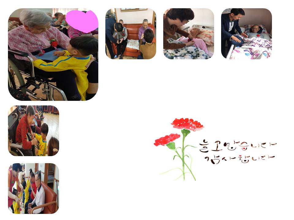 어버이날을 맞아 전 직원들이 어르신들을 위해 어머님 은혜를 부르며 가슴한켠에 카네이션을 달아드렸습니다.