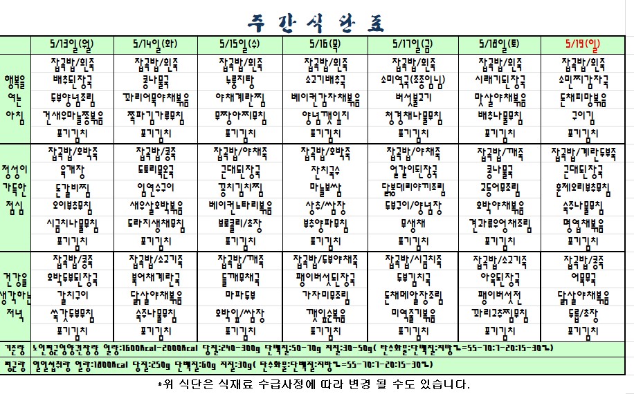 | 2019.05.13~05.19 주간식단표 관리자2019-05-13조회수 3632 |