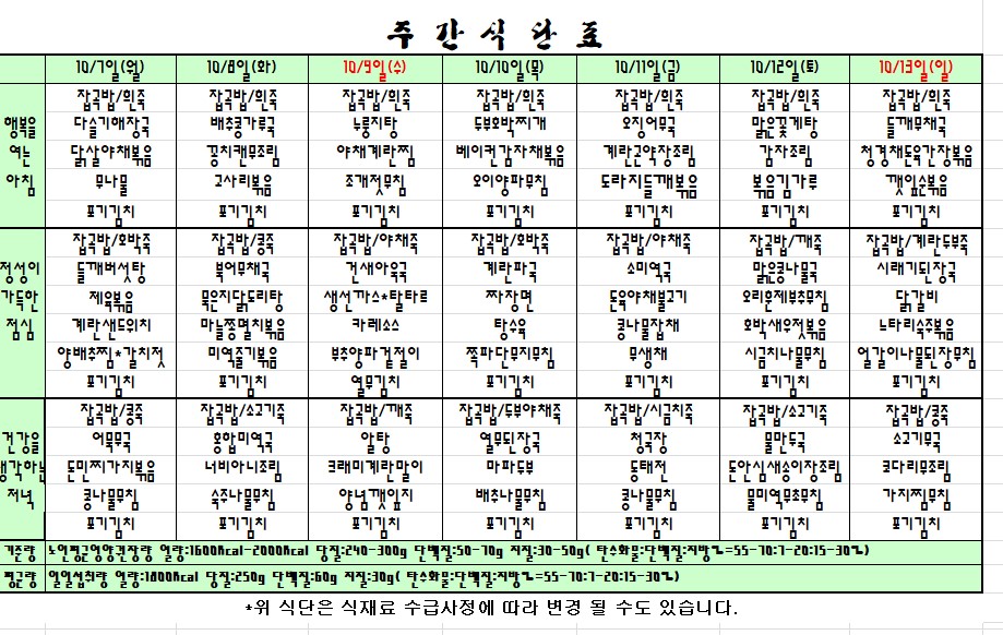 | 2019.10.07~10.13 주간식단표 관리자2019-10-04조회수 3589 |
