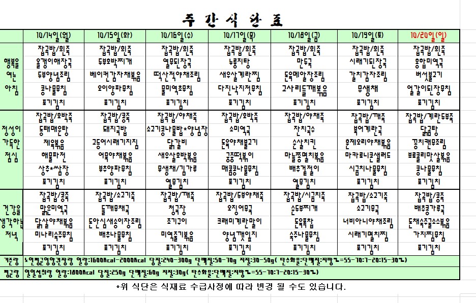 | 2019.10.14~10.20 주간식단표 관리자2019-10-11조회수 3559 |