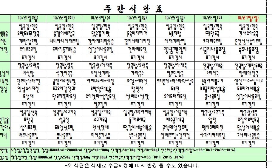 | 2019.10.21~10.27 주간식단표 관리자2019-10-18조회수 3486 |