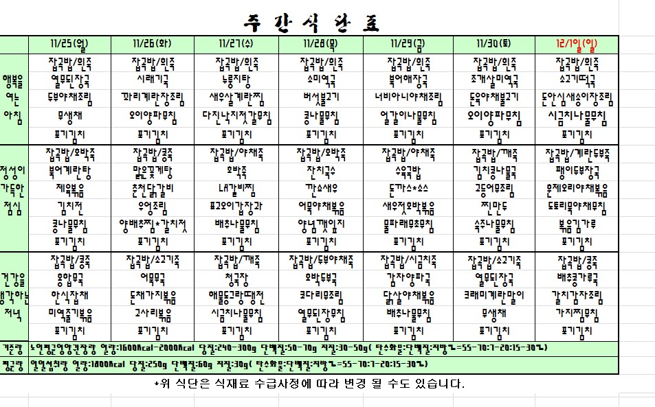 | 2019.11.25~12.01 주간식단표 관리자2019-11-22조회수 3510 |