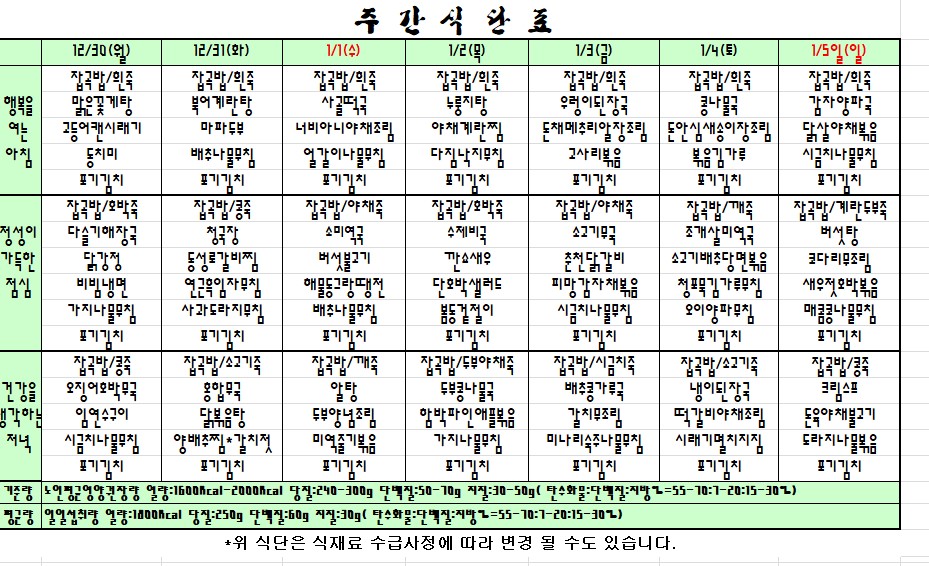 | 2019.12.30~01.05 주간식단표 관리자2019-12-27조회수 3668 |