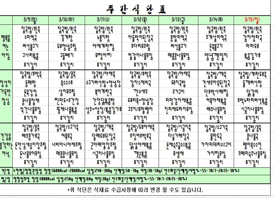 2020.03.09 ~ 03.15 주간식단표 입니다. |