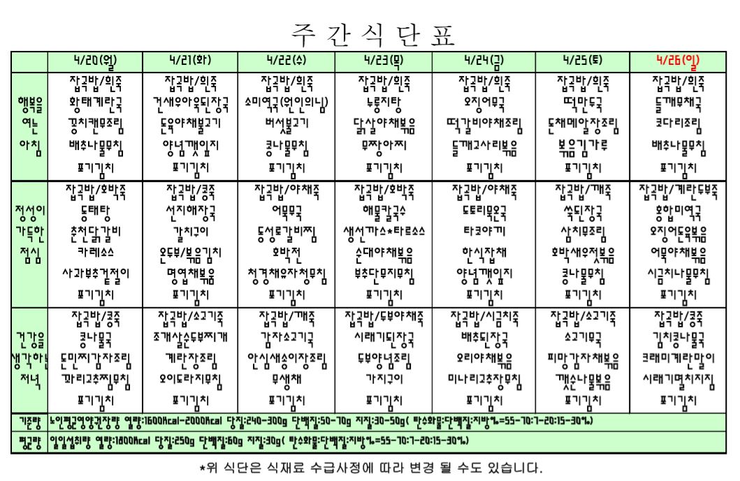 | 2020.04.20~04.26 주간식단표 관리자2020-04-29조회수 3573 |