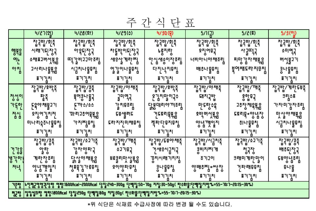 4월 5주 식단표입니다. |