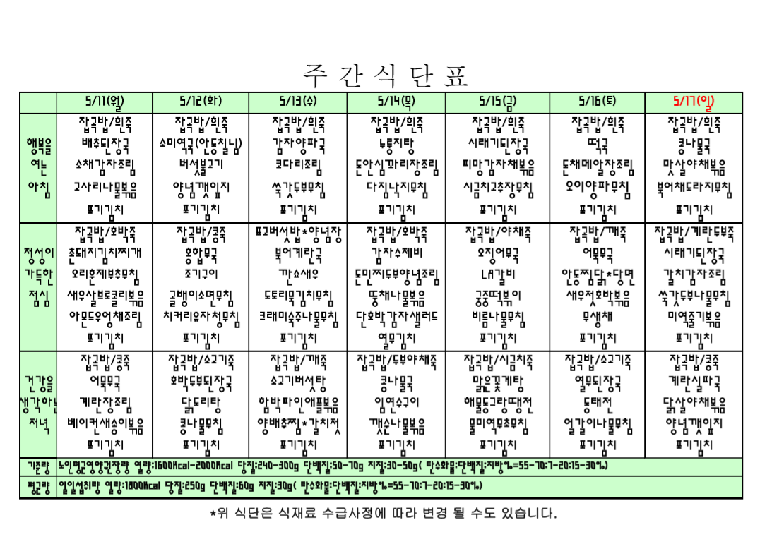 주간식단표입니다. |