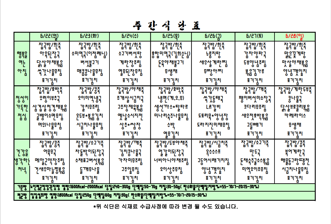 2020.6.22. ~ 6.28. 주간식단표