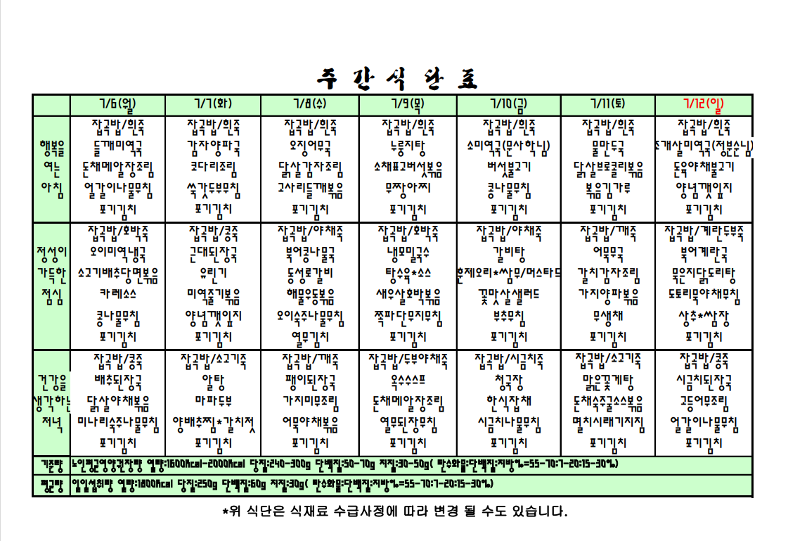 2020년 7월 6일 부터 12일까지 한주간 식단표 입니다. |