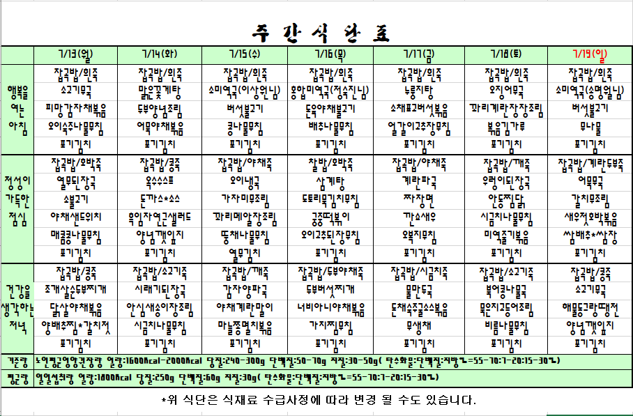 2020년 7월 13일부터 19일까지 식단표 입니다. |
