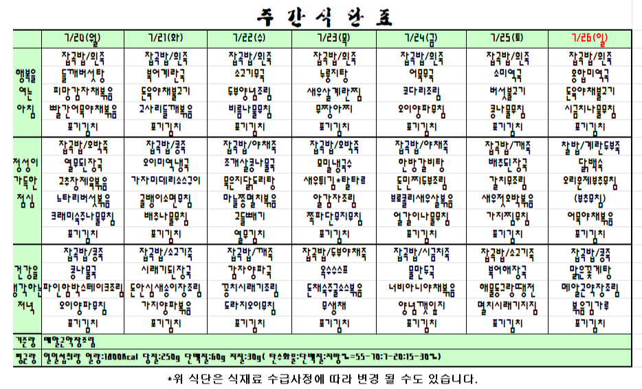 2020년 7월 20일 부터 26일까지 한주간 식단표 입니다. |