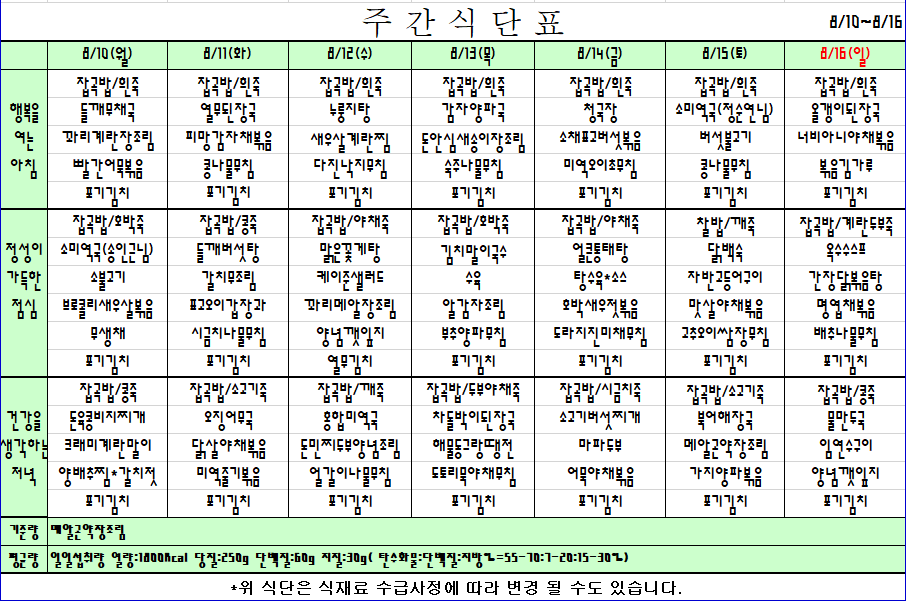 2020.08.10 ~08.16 주간식단표 입니다. |