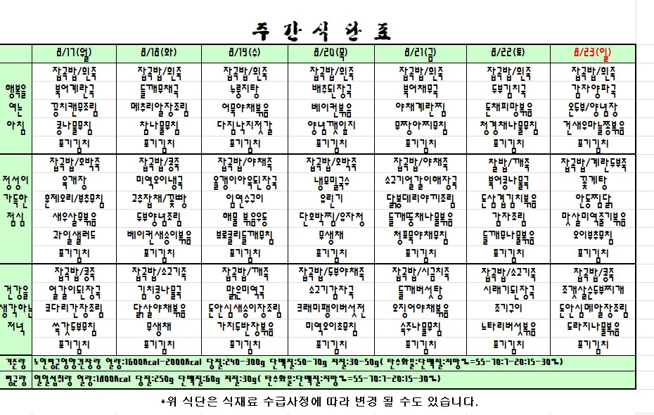 2020.08.17~08. 23 주간식단표 입니다. |
