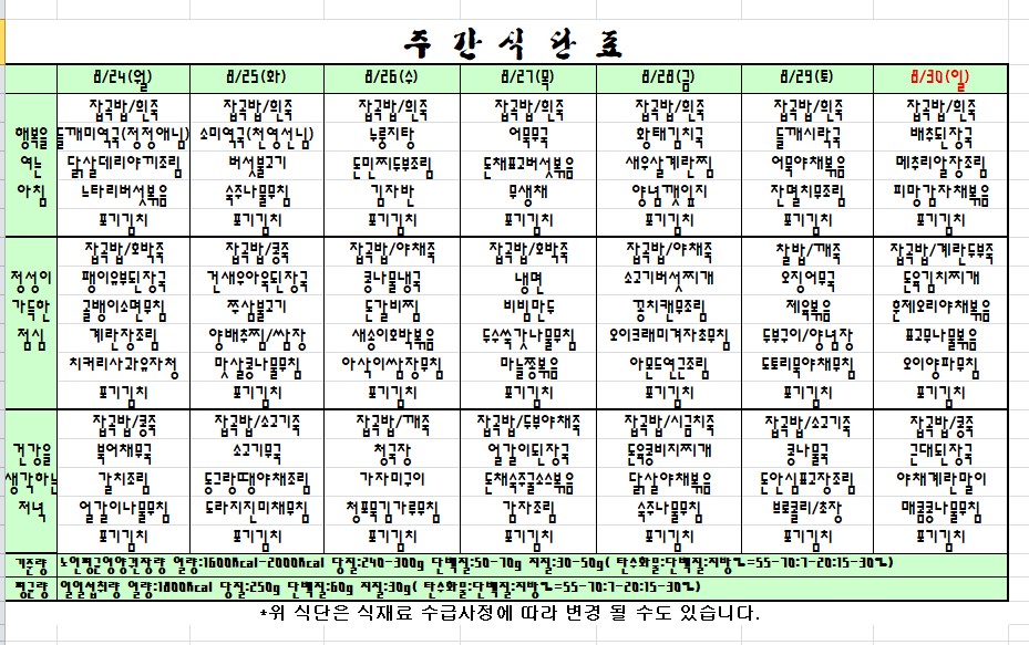 | 2020.08. 24~08. 30 주간식단표 관리자2020-08-21조회수 3594 |