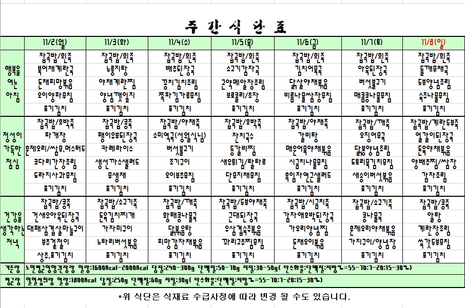 20. 11. 02 ~11. 08 주간식단표 입니다. |