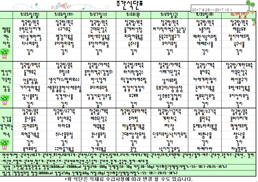 | 2017년 9월 25일 ~ 10월 1일 식단표 관리자2017-09-25조회수 3539 |