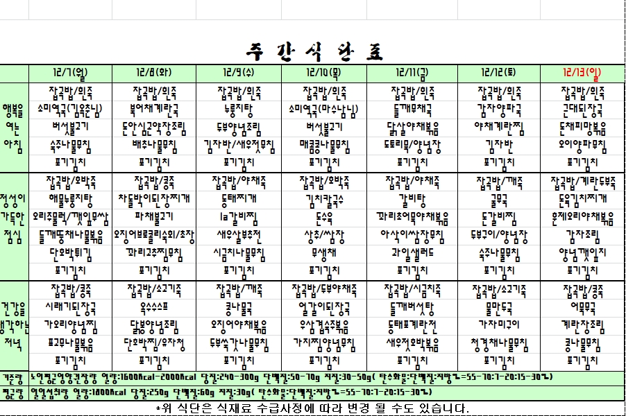 2020. 12. 07 ~ 12. 13 주간식단표 입니다. |