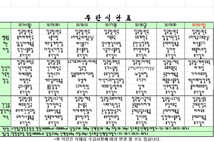 2020. 12. 14 ~ 12. 20 주간식단표 입니다.