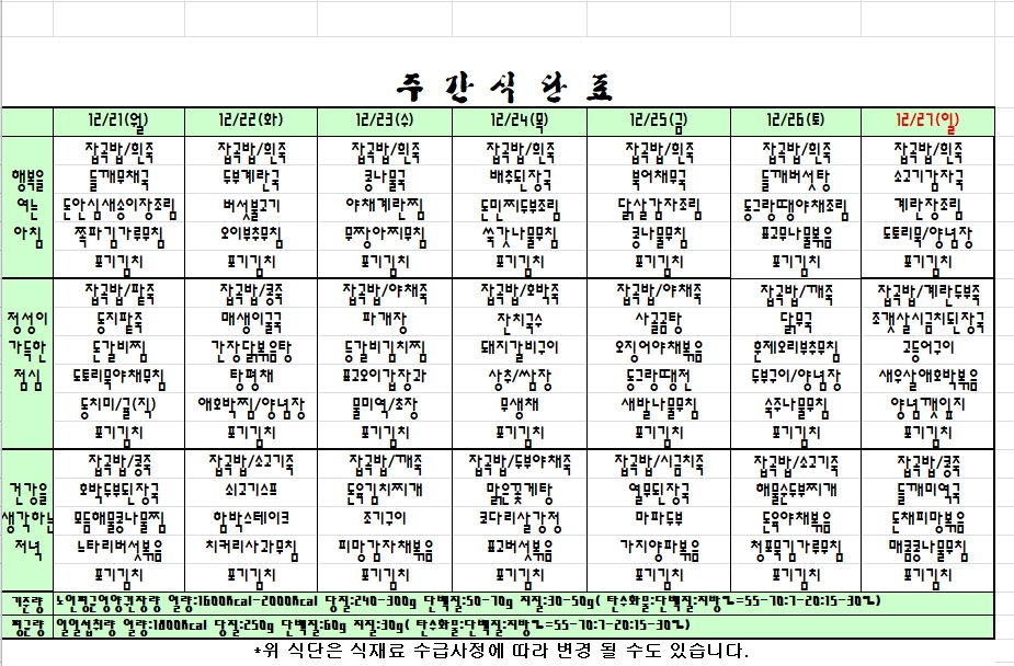 2020. 12. 21 ~ 12. 27 주간식단표