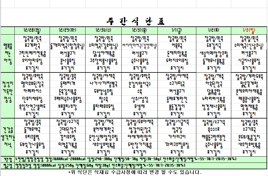 2020. 12. 28 ~ 2021. 01. 03 주간식단표 입니다.
