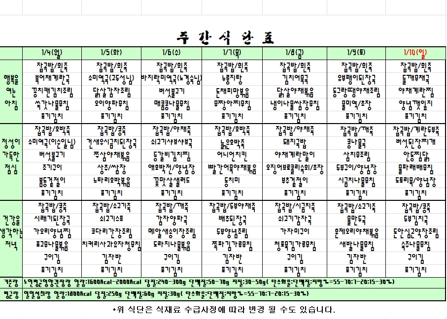 2021. 01. 04 ~ 01. 10 주간식단표 입니다.
