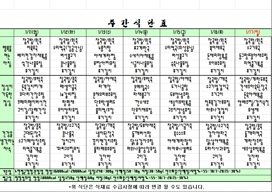 2021. 01. 11 ~ 01. 17 주간식단표 |