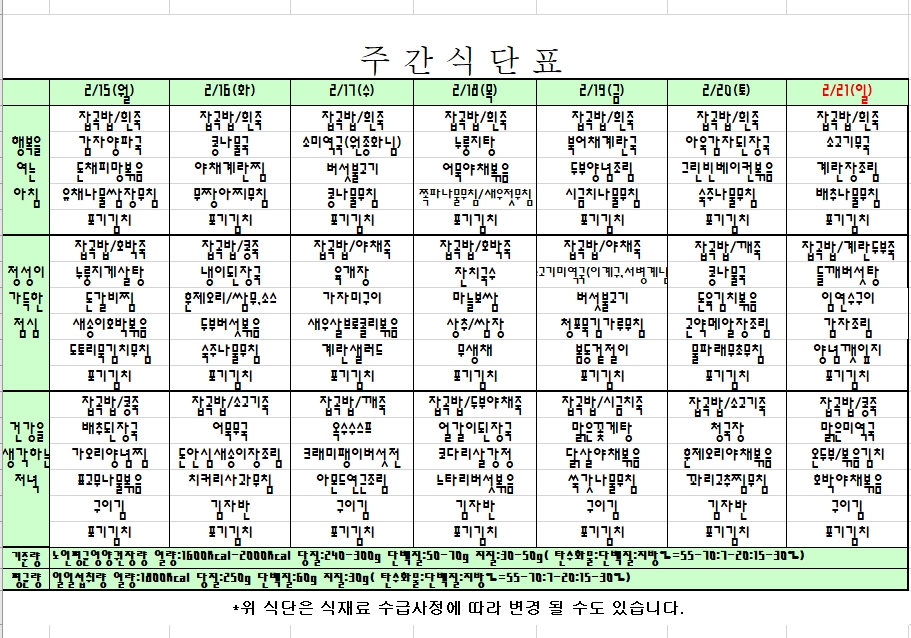 2021. 02. 15 ~ 02. 21 주간식단표 입니다.