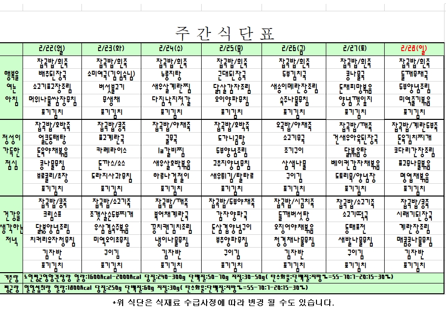 2021.02.22~02.28 주간식단표 입니다. |