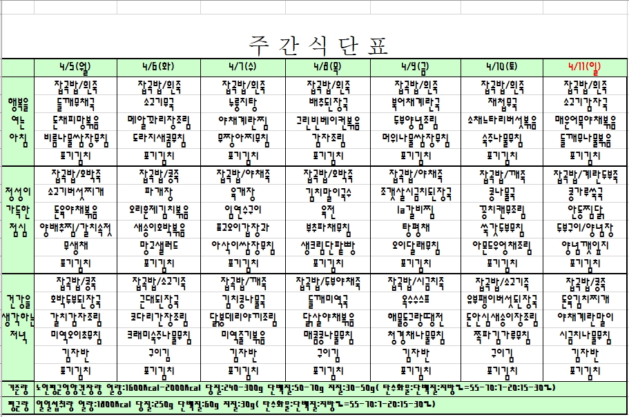 이전글 2021. 04. 12 ~ 04. 18 주간식단표