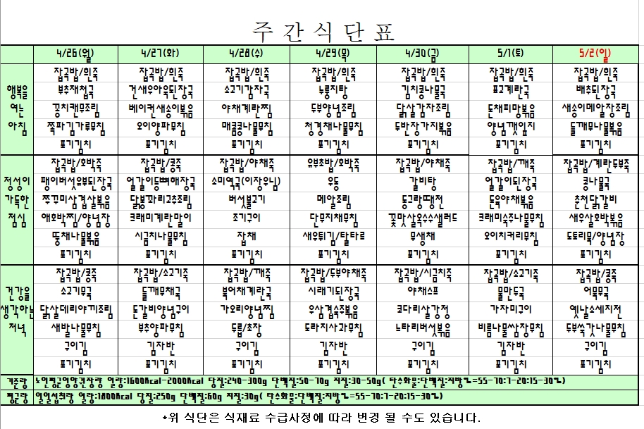 2021. 04. 26 ~ 05. 2 주간식단표 입니다. |