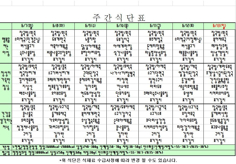2021. 06. 07 ~ 06. 13  주간식단표 입니다.