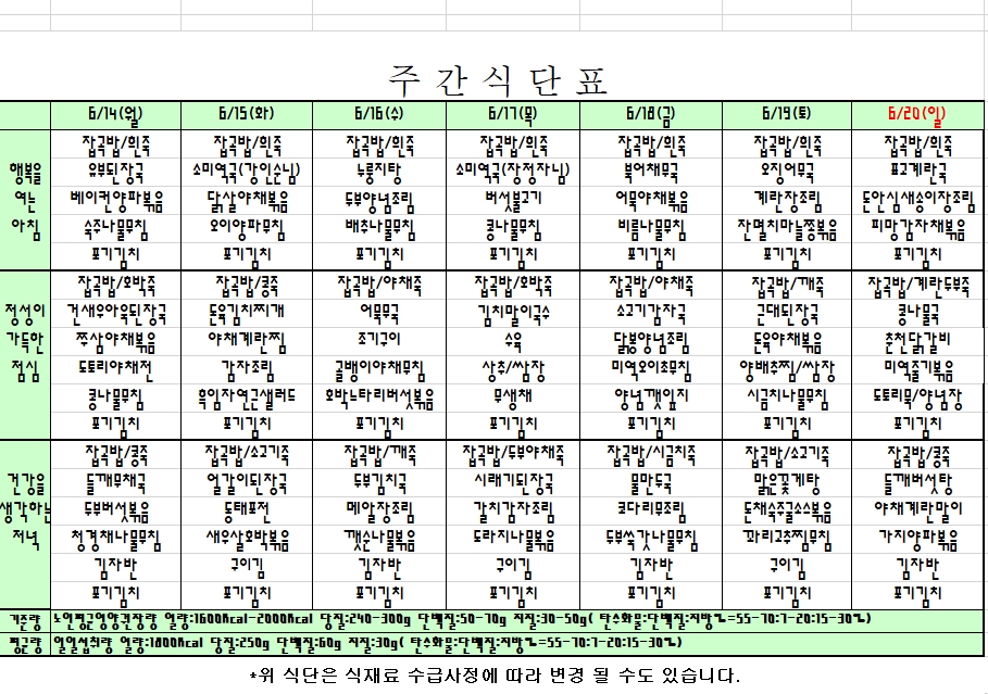 2021. 06. 14 ~ 06. 20  주간식단표 입니다.