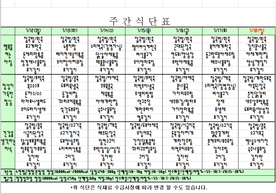 2021. 07. 12 ~ 07. 18 주간식단표