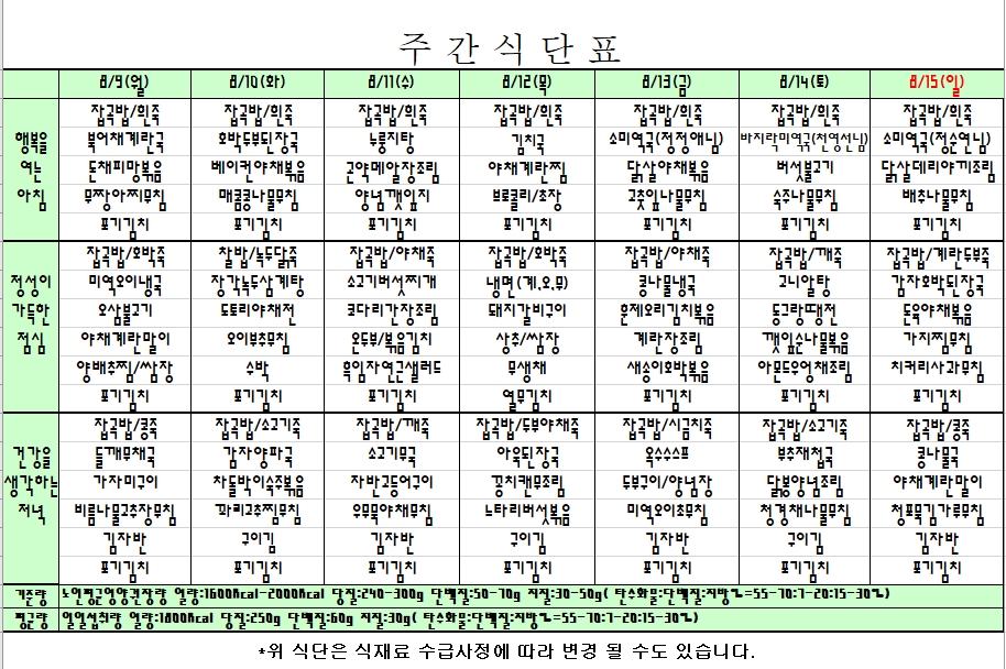 2021. 08. 09 ~ 08. 15 주간식단표