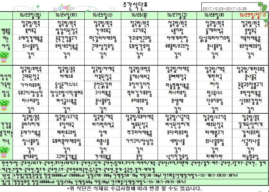| 2017년 10월 23일 ~ 29일 식단표 관리자2017-10-24조회수 3466 |