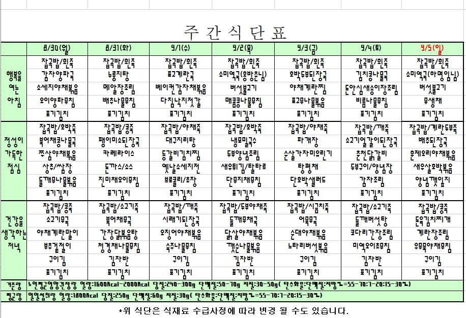 2021. 08. 30 ~ 09. 05 주간식단표입니다. |