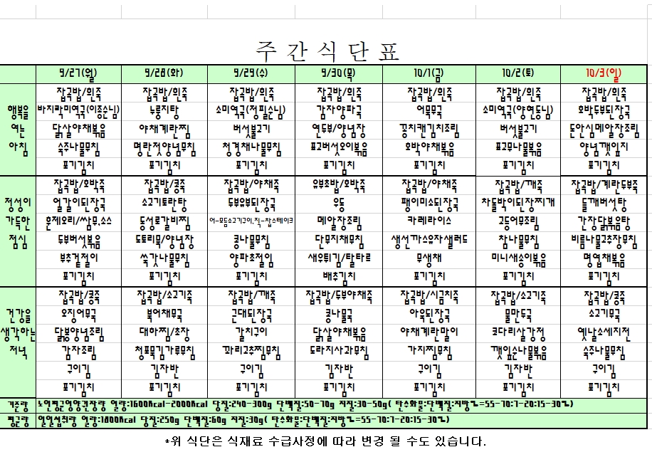 2021. 09. 27 ~ 10. 03 주간식단표