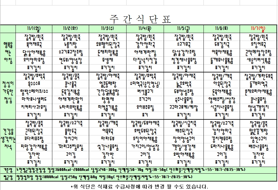 2021. 11. 01 ~ 11. 07 주간식단표입니다. |