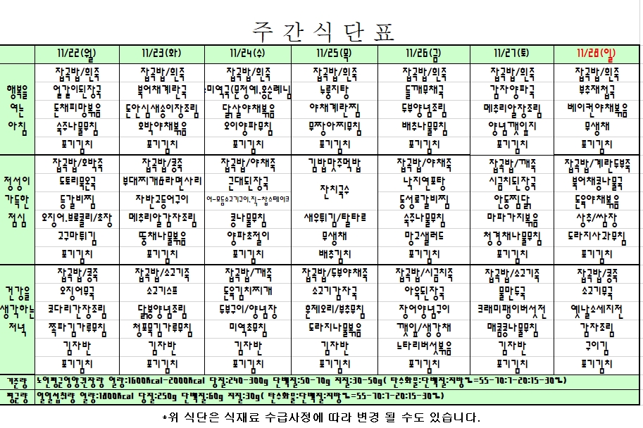 2021. 11. 22 ~ 11. 28 주간식단표입니다. |