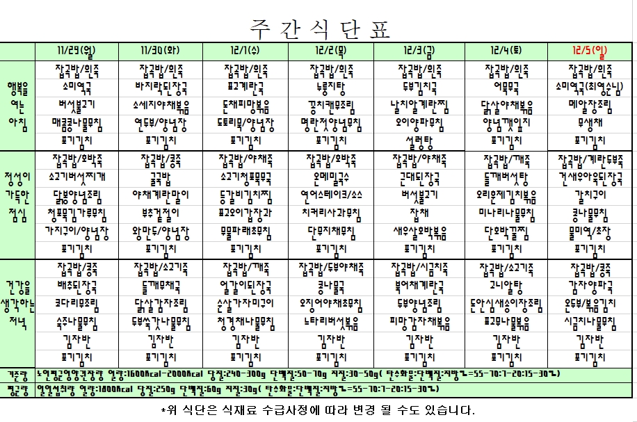 2021. 11. 29 ~ 12. 05 주간식단표