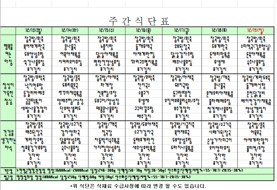 2021. 12. 13 ~ 12. 19 주간식단표입니다. |