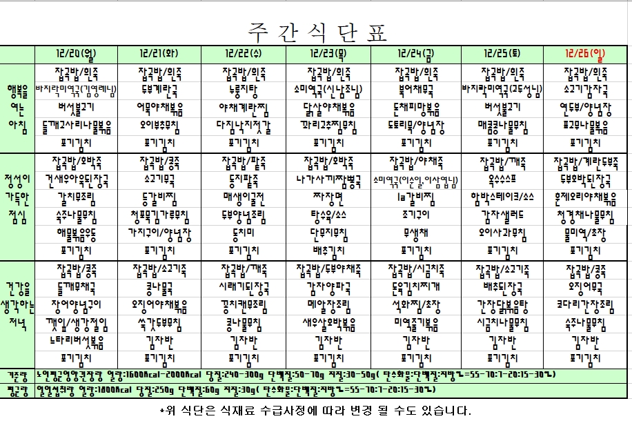 2021. 12. 20 ~ 12. 26 주간식단표