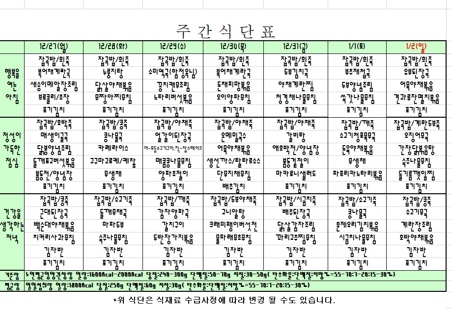 2021. 12. 27 ~ 2022. 01. 02  주간식단표 입니다.