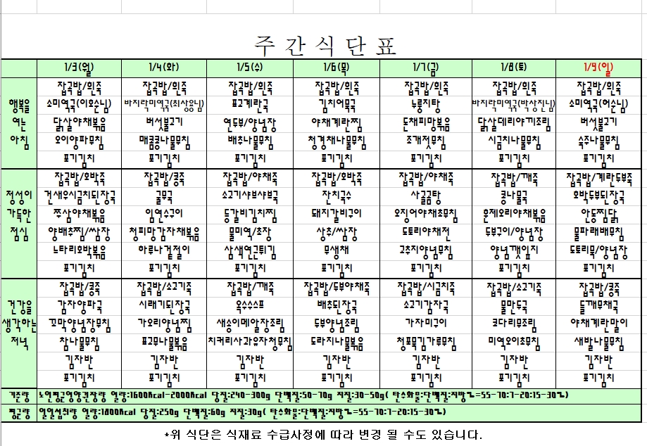 2022. 01. 03 ~ 01. 09  주간식단표 입니다.